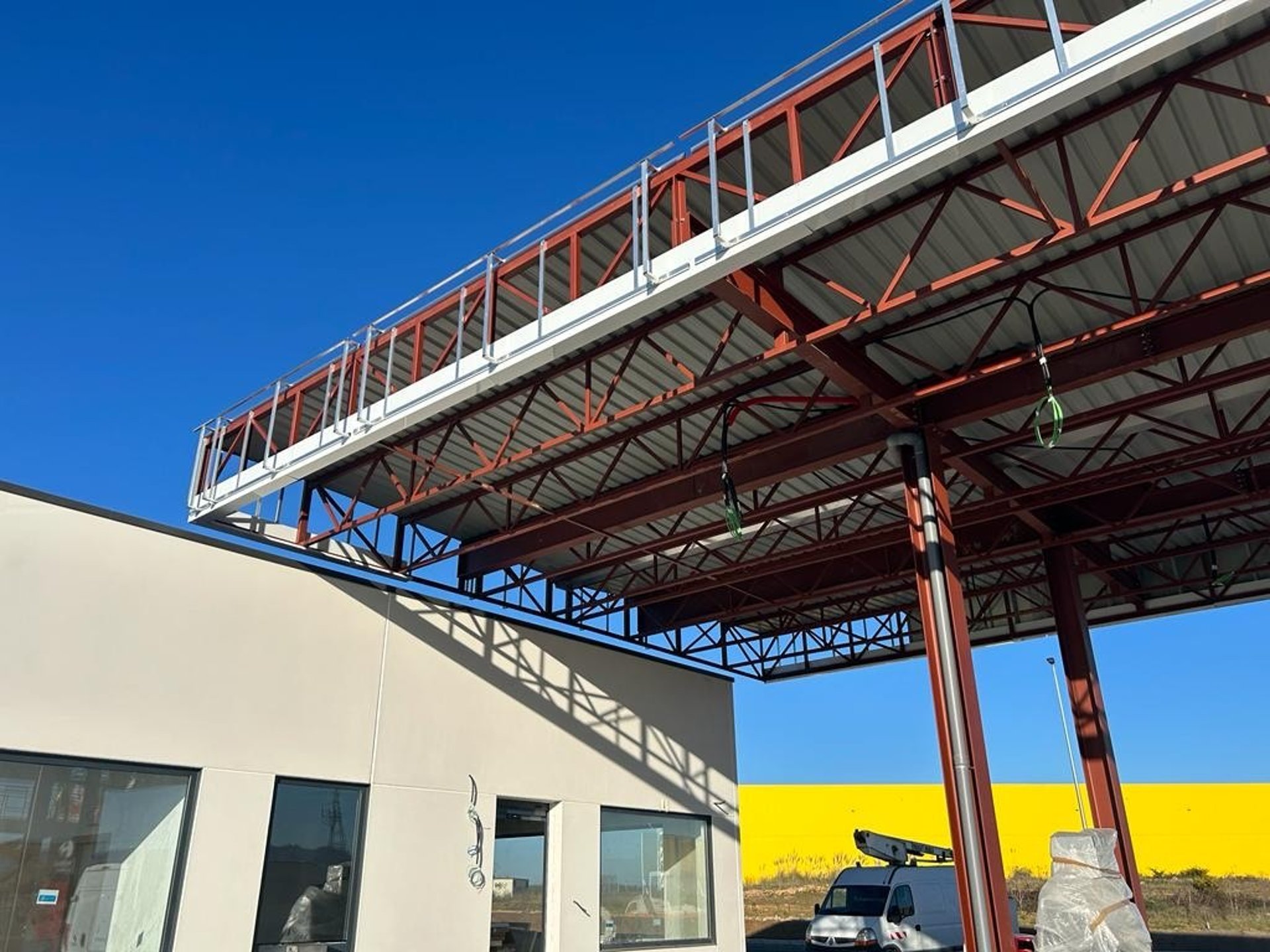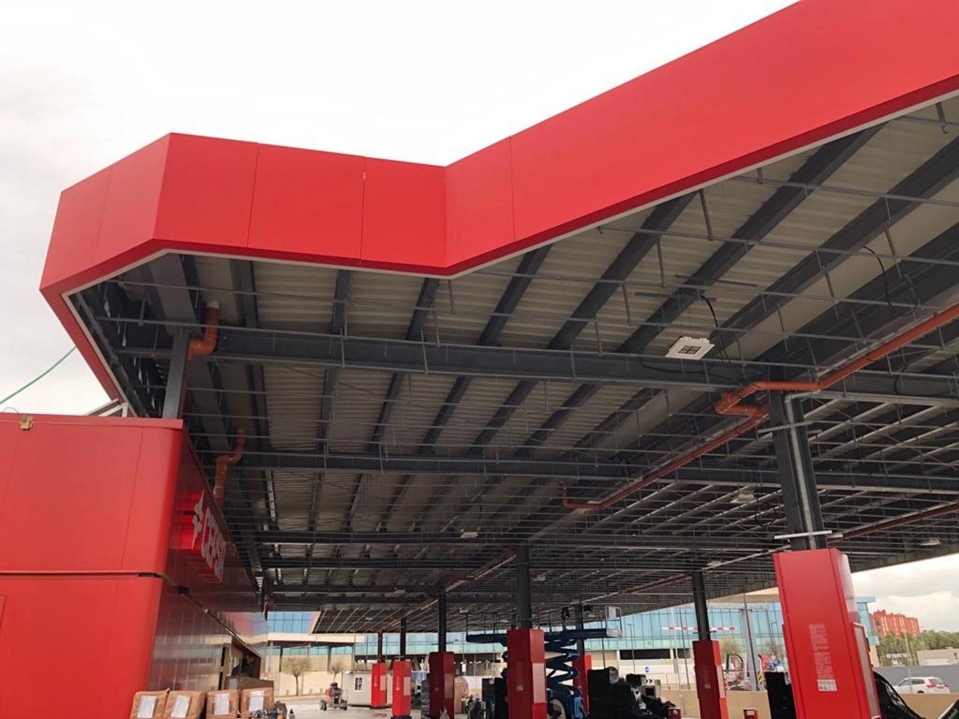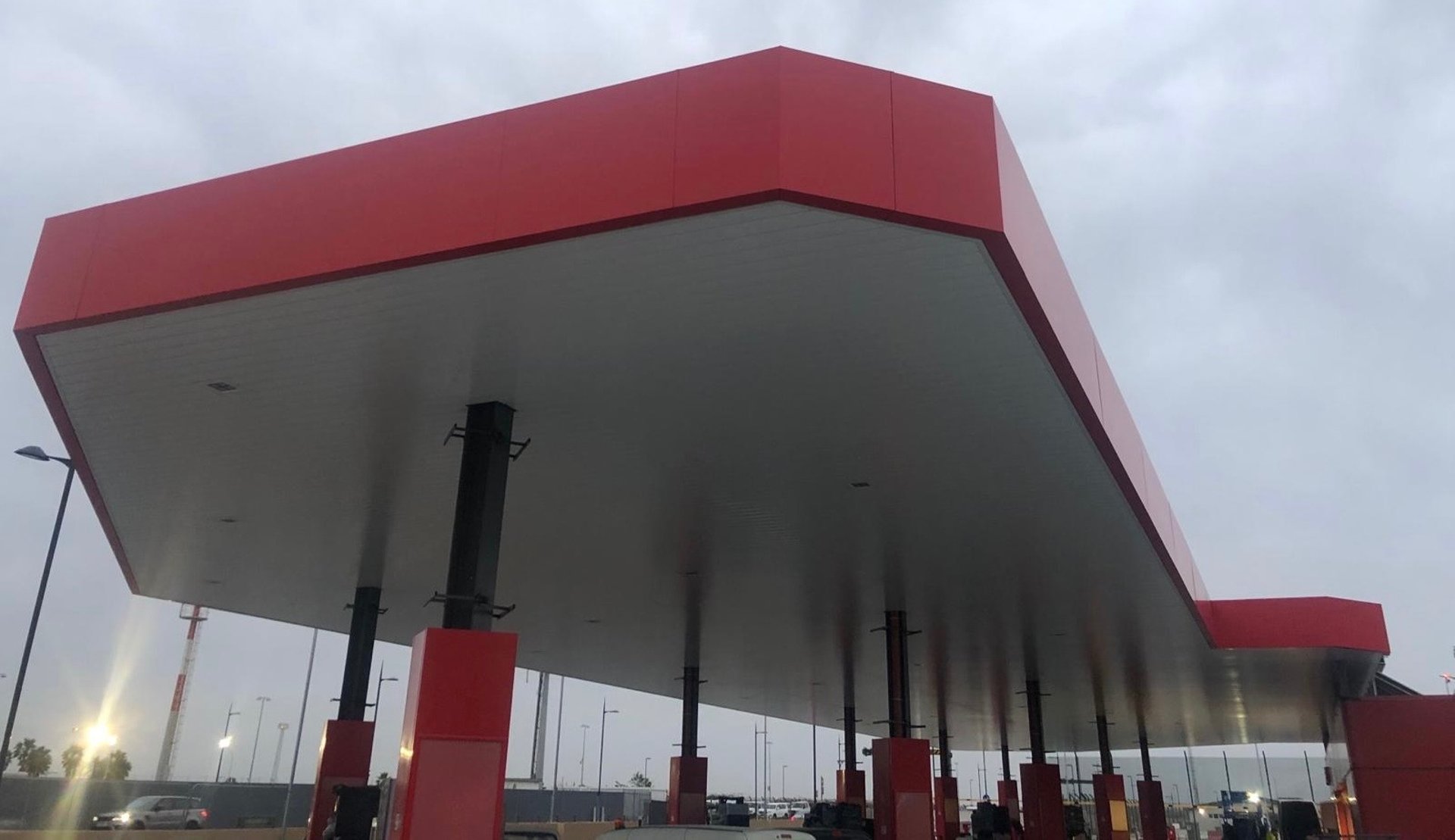 Suministro e instalación de falso techo de gasolinera con estructura auxiliar y colocación de chapa vierte-aguas sellado con poliuretano.