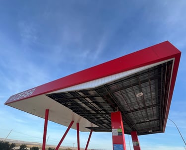 Desmontaje de falso techo y antigua chapa cubierta, incluyendo canalón. Montaje de falso techo de gasolinera con kit de focos, colocación de marcos pilares y creación de tabicas laterales. Reparación y mantenimiento de chapa cubierta, fabricación y sustitución de desagües (sombreretes). Colocación de mini-monolito y adhesivos.